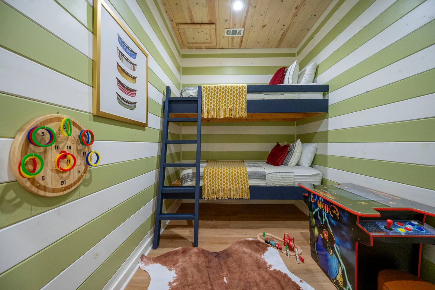 Welcome to Walking on Sunshine, a thoughtfully designed modern cabin where comfort, fun, and forest views come together for a memorable Broken Bow escape. Surrounded by trees and light, this three-bedroom retreat offers space to relax, reconnect, and make new memories with those you brought along. The space at a glance • 3 bedrooms, 3 full bathrooms • Sleeps up to 8 • Two king suites with ensuite baths • Bunk room with twin beds, TV, and arcade game • Queen pull-out sofa in the living room • Open living area with electric fireplace and large TV • Fully equipped kitchen and dining space • Fully stocked coffee bar • Hot tub, fire pit, and outdoor seating • Sauna • Forest views and peaceful setting • Pet Friendly (please include in your reservation) Step inside and you’ll find an open living area anchored by a large TV and electric fireplace, plush seating, and plenty of natural light that draws the outside in. The queen pull-out sofa adds flexible sleeping space without sacrificing style. The fully equipped kitchen and generous dining setup make shared meals effortless, whether it’s morning coffee or a casual dinner before heading out for adventure. Each main bedroom features a king bed and ensuite bathroom with double vanities and walk-in showers, while the third bedroom offers twin bunk beds and its own TV and arcade game — perfect for kids or extra guests. With three full bathrooms and thoughtful layout throughout, everyone has room to spread out and unwind. Outdoor living truly shines here. Warm up in the sauna, soak in the hot tub, or gather around the fire pit while the forest stretches out before you. With seating for larger groups, firelight, and a TV, evenings outside feel easy and unhurried. Located close to Broken Bow Lake, Beavers Bend State Park, local breweries, restaurants, and trails. You’re never far from your next adventure yet far enough away to feel like you’ve escaped.